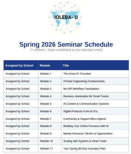The IOLEBA Spring 2026 Seminar is a proprietary, non-API training system designed to move students and entrepreneurs from digital anxiety to economic mastery. This isn’t just a course; it’s a complete infrastructure.